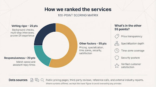 We pulled data from public pricing pages, third-party reviews, reference calls, and the latest Forbes Advisor report on virtual assistant services. When figures clashed, we kept the lower number to avoid overselling any provider.