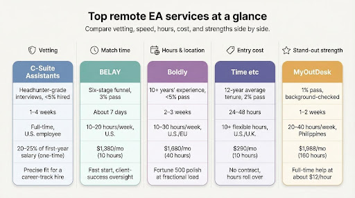 Prices reflect common 2026 entry plans; confirm current quotes before you commit. In short, pick C-Suite for a long-term hire; BELAY or Boldly for polished fractional help; Time etc when flexibility rules; and MyOutDesk when you want maximum hours per dollar.