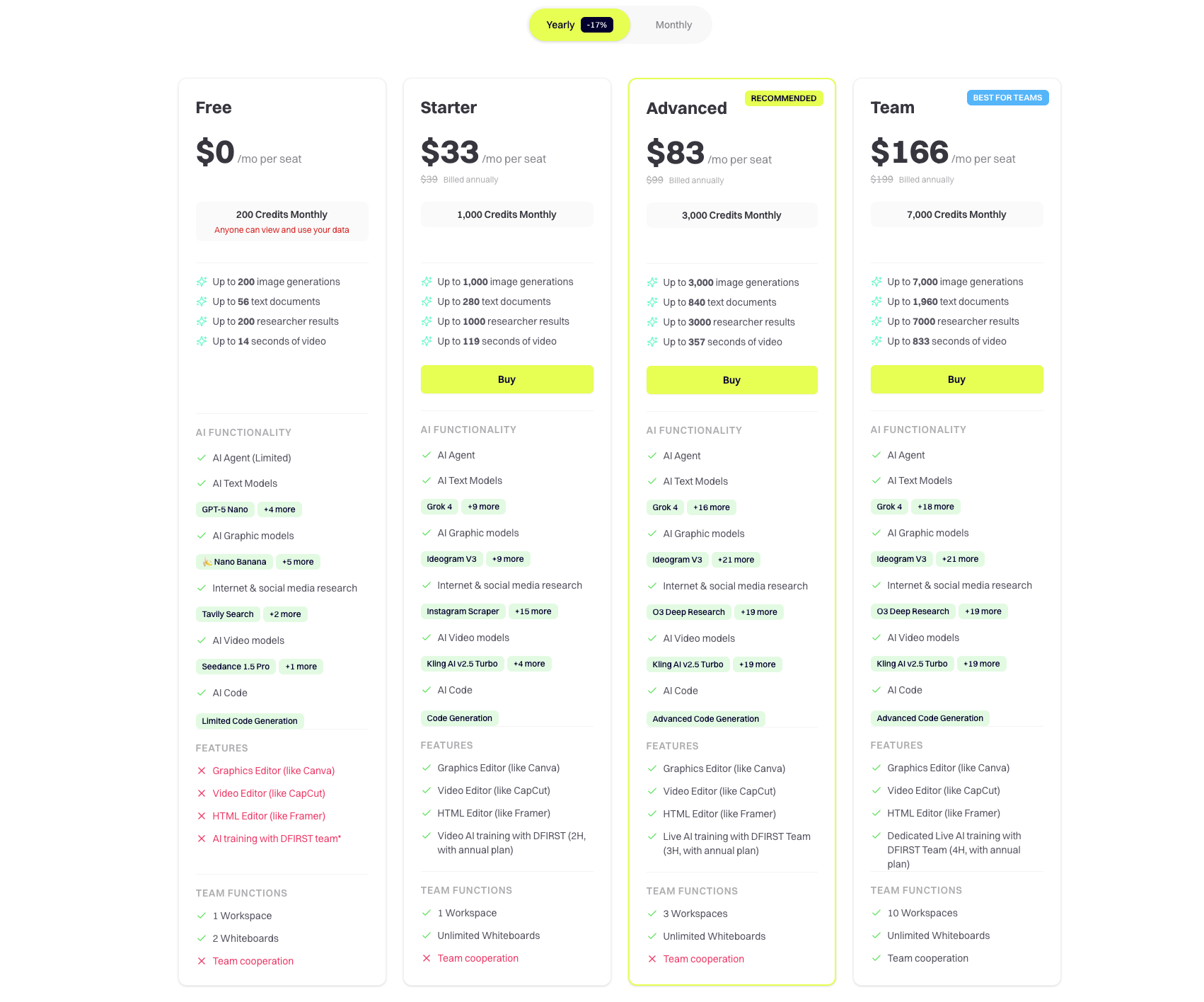 Dfirst offers four main monthly plans for different needs. Free includes 200 credits per month for basic testing. Starter costs 33 dollars per seat and gives 1,000 credits. Advanced costs 83 dollars per seat with 3,000 credits. The team costs 166 dollars per seat and includes 7,000 credits. Higher tiers also raise limits for image generations, text documents, research calls, and video seconds, while keeping access to core AI tools for text, graphics, video, and code.